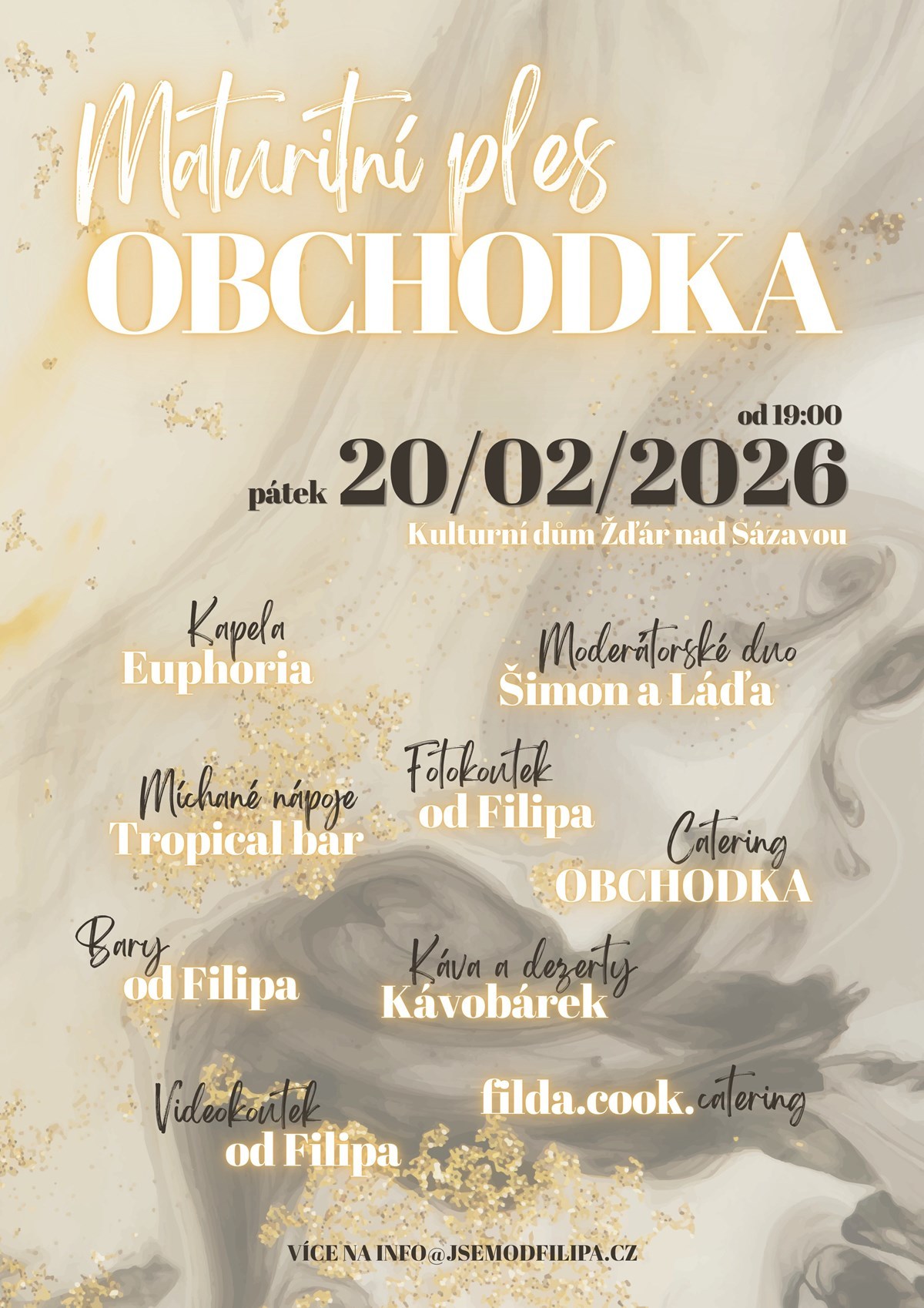 MATURITNÍ ples OBCHODKA se bude konat v PÁTEK 20. února 2026 od 19 hodin v KULTURÁKU ve Žďáře nad Sázavou.