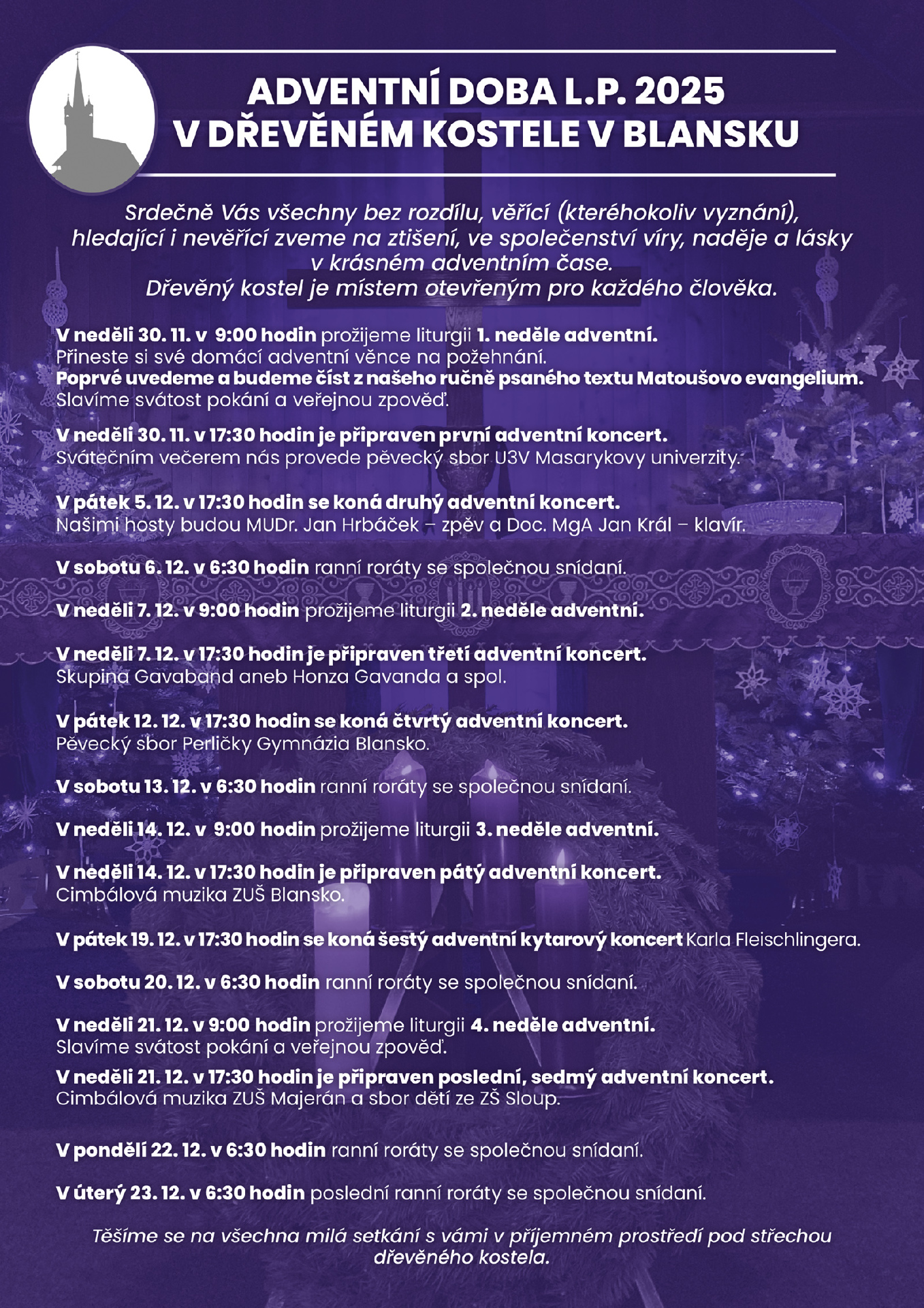 ADVENTNÍ PROGRAM V DŘEVĚNÉM KOSTELE V BLANSKUSrdečně vás zveme na příjemná adventní setkání pod střechou blanenského Dřevěného kostela. Buďte vítání nejen v čase před vánočním.
