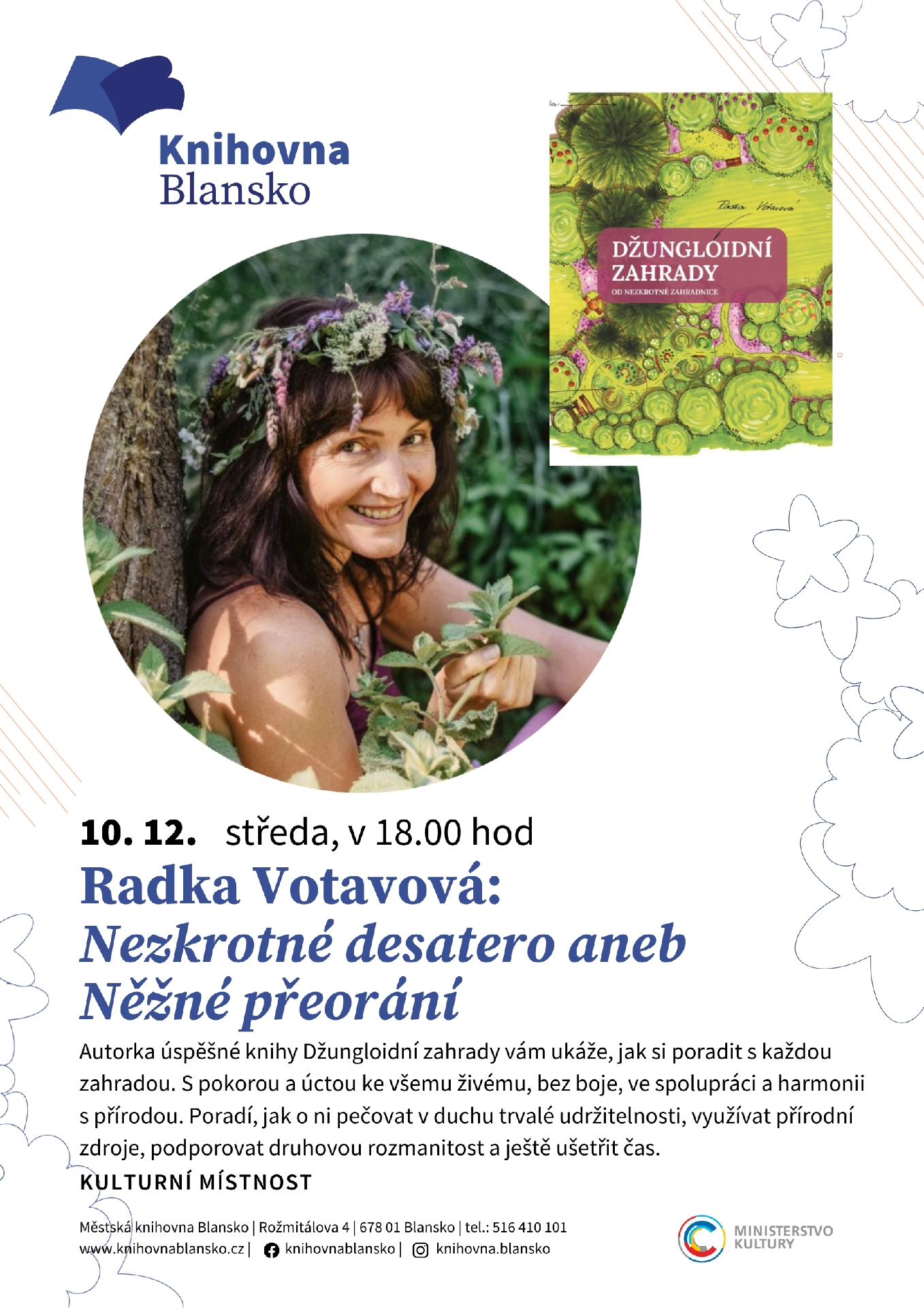 Radka Votavová alias Nezkrotná zahradnice, autorka úspěšné knihy Džungloidní zahrady, vám ukáže, jak si poradit s každou zahradou. S pokorou a úctou ke všemu živému, bez boje, ve spolupráci a v harmonii s přírodou. Poradí, jak o ni pečovat v duchu trvalé udržitelnosti, využívat přírodní zdroje, podporovat druhovou rozmanitost a ještě ušetřit čas. Budeme si povídat o zahradách, ale i o vzniku knihy a připravované knižní novince. Za finanční podpory MK ČR.