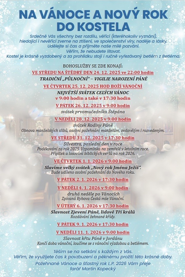 Srdečně Vás všechny bez rozdílu, věřící (kteréhokoliv vyznání), hledající i nevěřící zveme na ztišení, ve společenství víry, naděje a lásky. Udělejte si čas a přijměte naše milé pozvání. Kostel je krásně vyzdobený a za prohlídku stojí i ručně vyřezávaný betlém z Betléma. Těším se na setkání s každým z Vás. Věřím, že využijete čas k povzbuzení a pěknému prožití této krásné doby. Požehnané Vánoce a šťastný rok L.P. 2026 Vám přeje farář Martin Kopecký