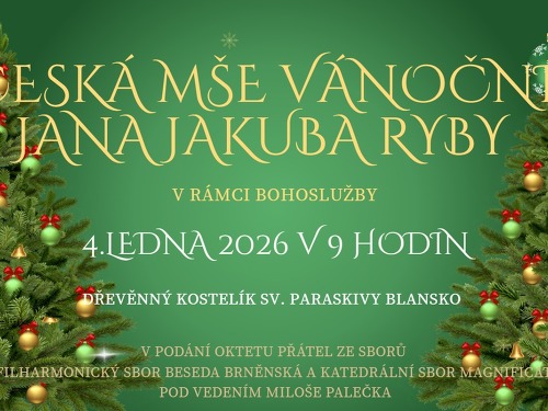 Rád bych vás pozval v nadcházejících dnech na setkání u nás v Dřevěném kostele v Blansku v neděli 4.1.2026 v 9 hodin. V rámci bohoslužby zazní zpívaná Rybova Česká mše vánoční. Jde o zcela mimořádný zážitek! Úplně poprvé budeme mít u nás provedení tzv. Rybovky zpívané komorním sborem během bohoslužeb. To si nenechte ujít.