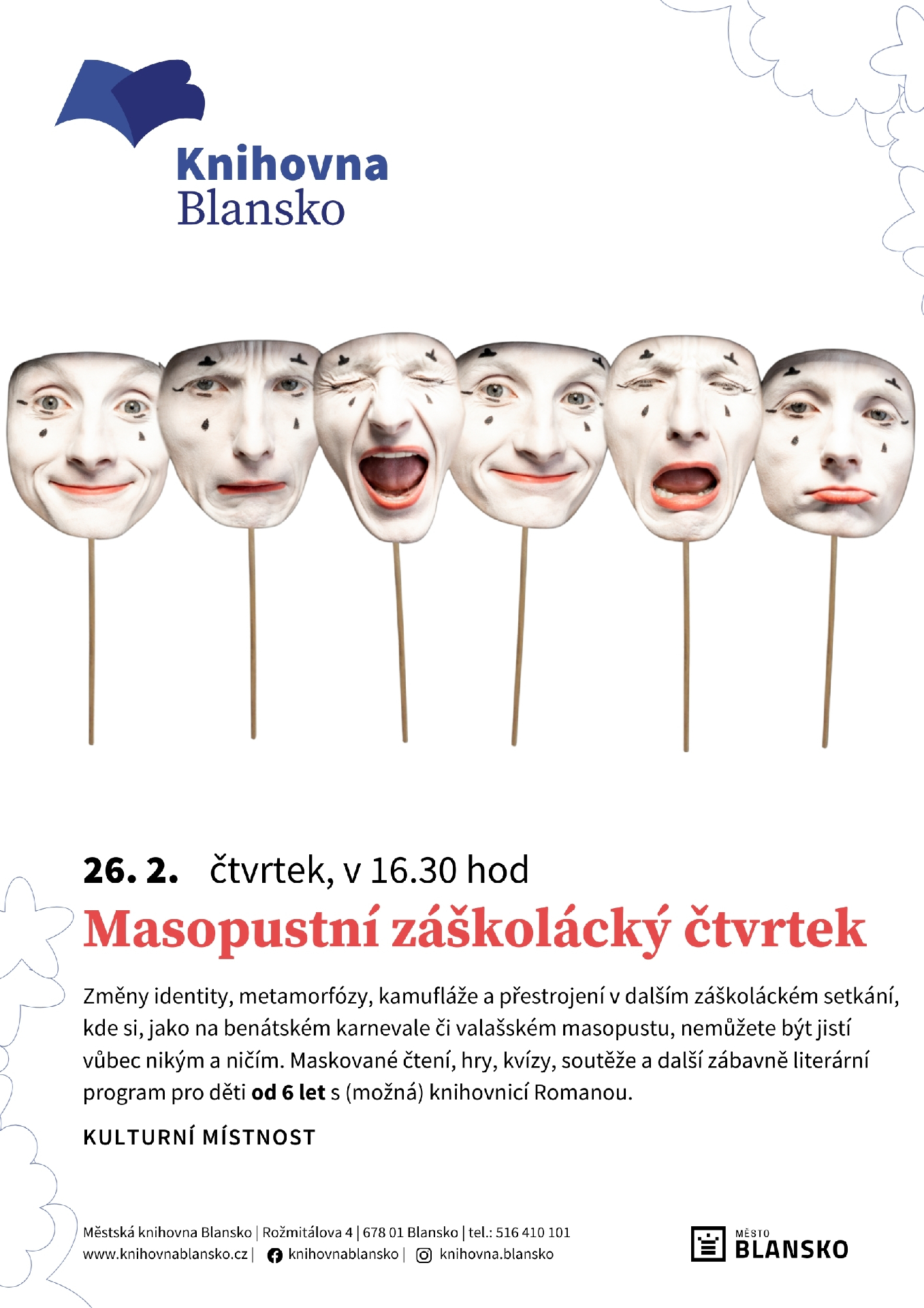 Změny identity, metamorfózy, kamufláže a přestrojení v dalším záškoláckém setkání, kde si, jako na benátském karnevale či valašském masopustu, nemůžete být jistí vůbec nikým a ničím. Maskované čtení, hry, kvízy, soutěže a další zábavně literární program pro děti od 6 let s (možná) knihovnicí Romanou.