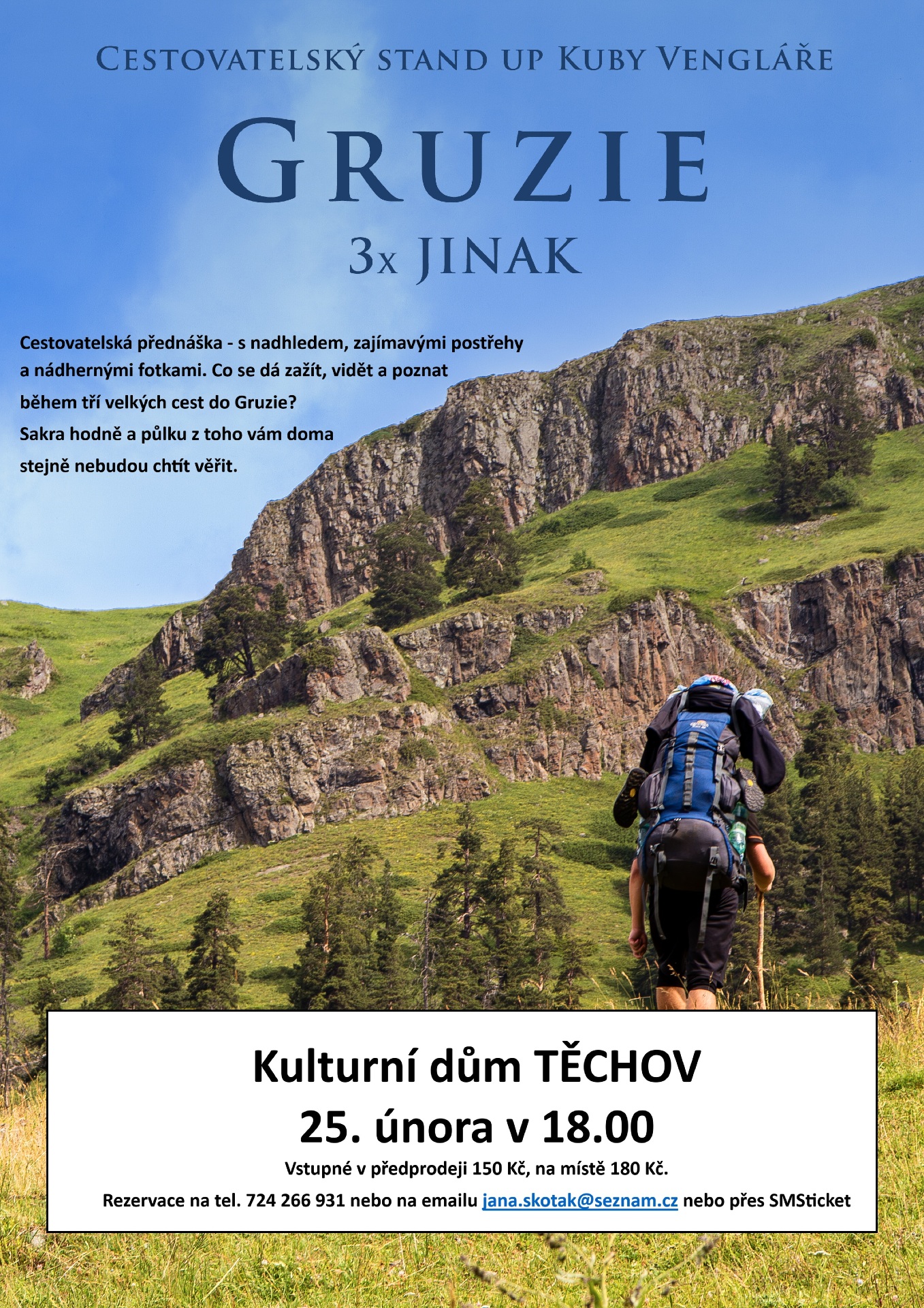 Kuba Venglář - Gruzie - cestovatelská přednáška - s nadhledem, zajímavými postřehy a nádhernými fotkami. To jsou Kubovy přednášky, proto si ho rádi zveme znovu. Co se dá zažít, vidět a poznat během tří velkých cest do Gruzie? Sakra hodně a půlku z toho vám doma stejně nebudou chtít věřit. Společně si projdeme několik nádherných horských treků, vystoupáme na pětitisícovku a zažijeme gruzínskou přírodu od léta do drsné zimy. Nebude to ale žádná tuctová kochačka, nýbrž svérázná ochutnávka výprav po netradičních trasách, kde hory, kolemjdoucí i vlastní hloupost dokáží cestu pořádně opepřit. Kromě horských dobrodružství nahlédneme pod pokličku života na Kavkaze, seznámím vás s těmi nejzajímavějšími lidmi, které jsme potkali, zasmějete se u divokých historek, prozkoumáme pár velkolepých (více či méně historických) pamětihodností a vůbec ochutnáme to nejlepší, co Gruzie nabízí. Přijďte se inspirovat pro vlastní cestu nebo „jen″ dobře pobavit Promítáme na úhlopříčku 7 metrů. Vstupné v předprodeji 150 Kč, na místě 180 Kč. Rezervace na tel. 724 266 931 nebo na emailu jana.skotak@seznam.cz, předprodej v Hospůdce Na Točně na Těchově nebo přes SMS Ticket