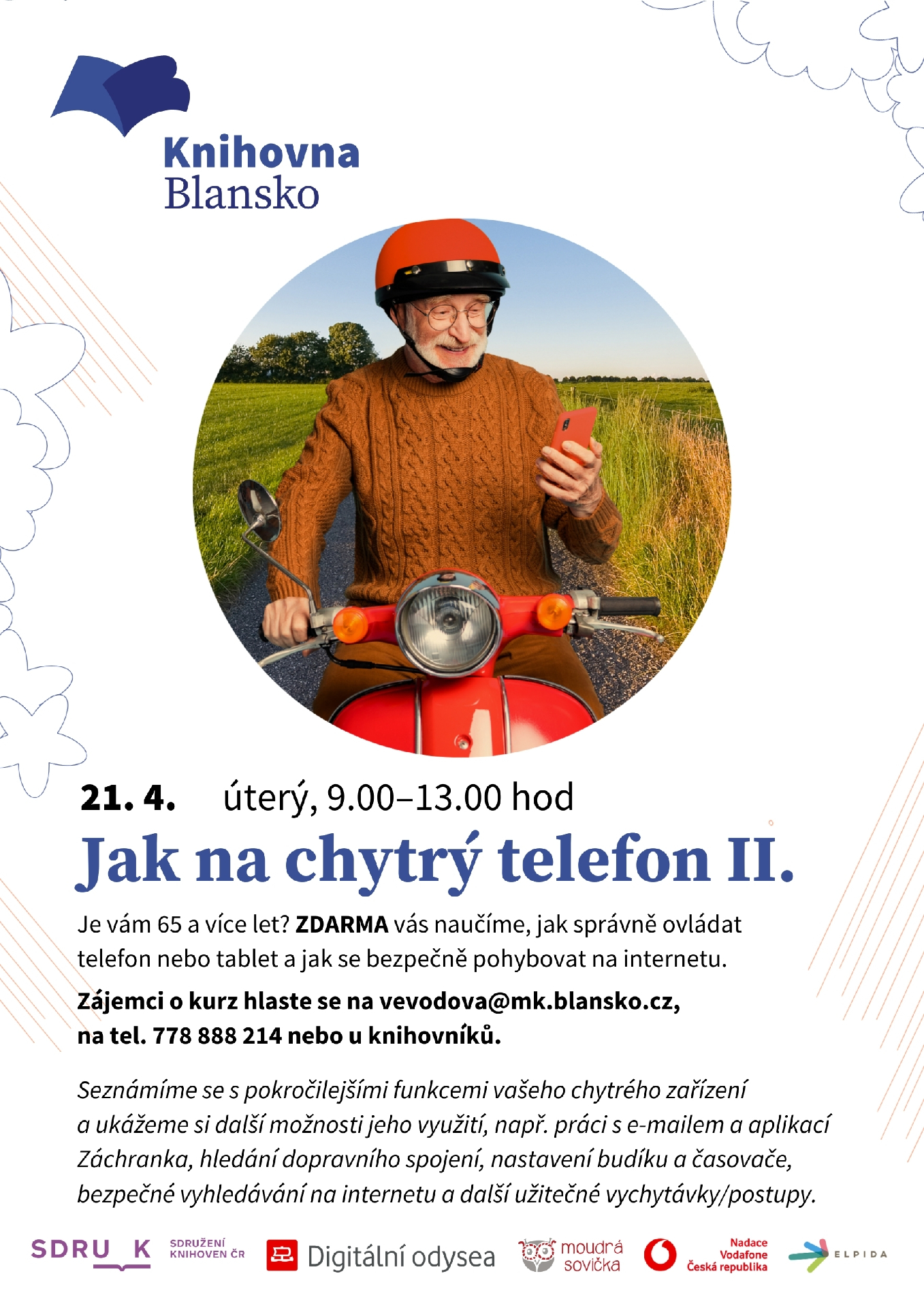 Je vám 65 a více let? Zdarma vás naučíme, jak správně ovládat telefon nebo tablet a jak se bezpečně pohybovat na internetu. Seznámíte se s pokročilejšími funkcemi chytrého zařízení. Ukážeme si další možnosti jeho využití, např. úpravu a sdílení fotek nebo práci s budíkem a kalendářem, osvojíte si vyhledávání na internetu, naučíte se vyhledávat dopravní spojení a pracovat s aplikací Záchranka. Dozvíte se další bezpečnostní tipy a triky.