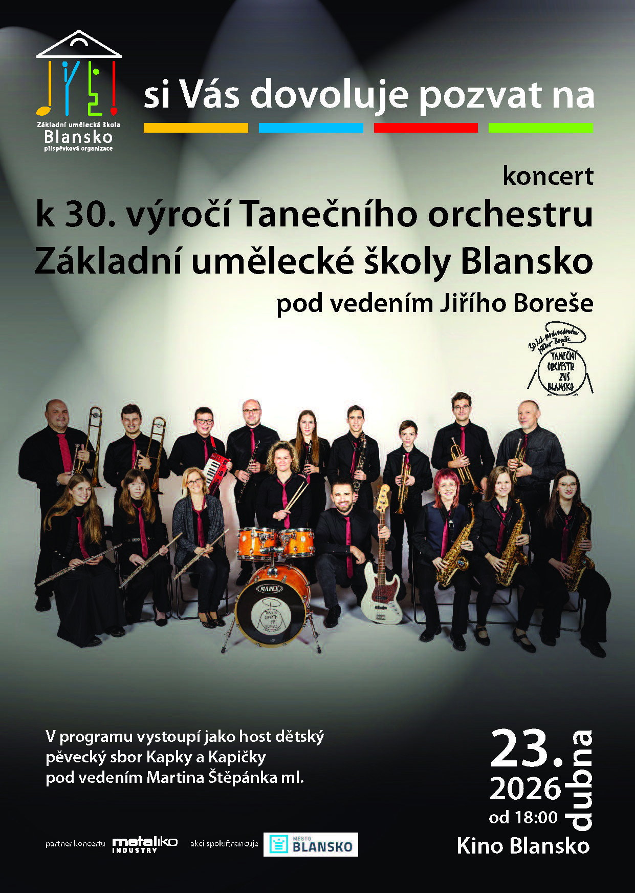 Koncert proběhne v sálu Kina Blansko a čeká vás večer, který propojí minulost i současnost orchestru a připomene, proč má Taneční orchestr ZUŠ Blansko své pevné místo na hudební scéně.
