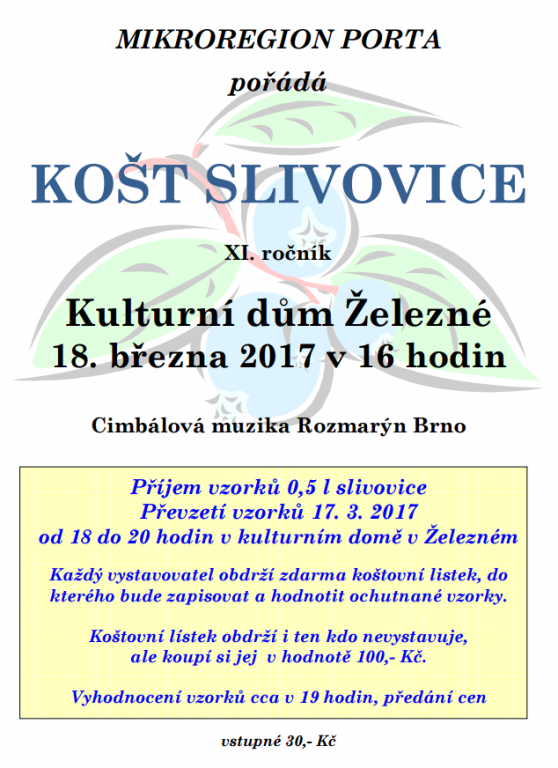 V kulturním domě v Železném můžete 18. března od 16 hodin přijít na Košt slivovice, a to buď jako soutěžící se svým vlastním vzorkem, nebo jen jako ochutnavač a návštěvník.