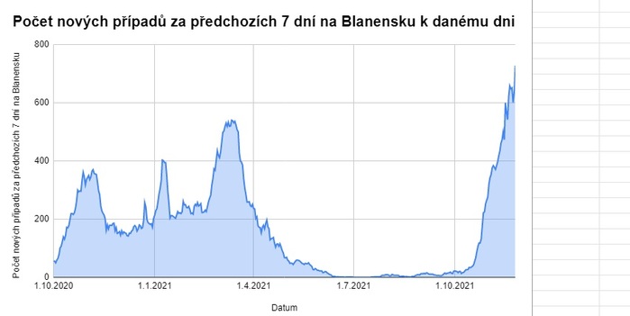 Následující graf shrnuje počet nových případů za posledních 7 dní na Blanensku od počátku března 2020, kdy se začala tato data počítat, do 25. listopadu 2021. Data vycházejí z otevřených datových sad Ministerstva zdravotnictví České republiky.