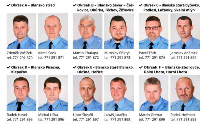 Kontakty na konkrétní městské policisty lze najít také na webových stránkách města v sekci Samospráva/ Městská policie/Kontakty/Strážníci v okrscích nebo pomocí přímého odkazu na hlavní stránce www.blansko.cz.