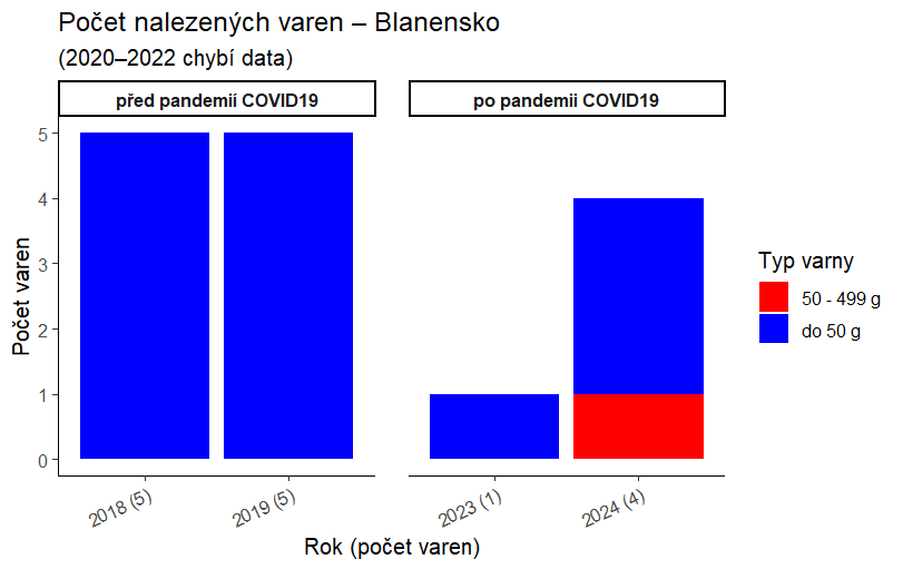 V období před pandemií COVID-19 (2017–2019) bylo na Blanensku odhaleno 10 varen. V letech 2020–2022 nejsou v oficiálních statistikách zaznamenány žádné (chybí kompletní data za pandemické období). Po covidu se zdálo, že se situace ustálila a roku 2024 byla nalezena pouze jedna varna. Nicméně hned další rok byly nalezeny hned 4 varny, z toho jedna střední velikosti od 50-500 gramů. V roce 2025 nebyla nalezena ani jedna varna. Takový trend skutečně může naznačovat, že produkce v regionu v posledních letech značně klesla a již se dále nešíří vědomosti potřebné k výroby pervitinu poté, co původní komunity a jednotlivci byli pristiženi policií.