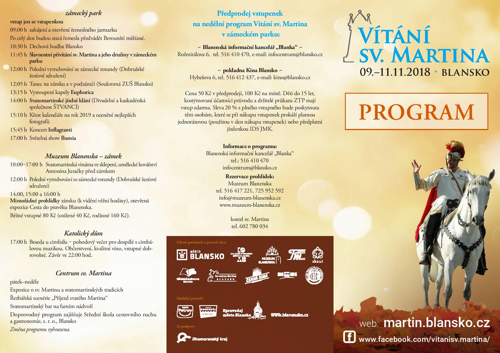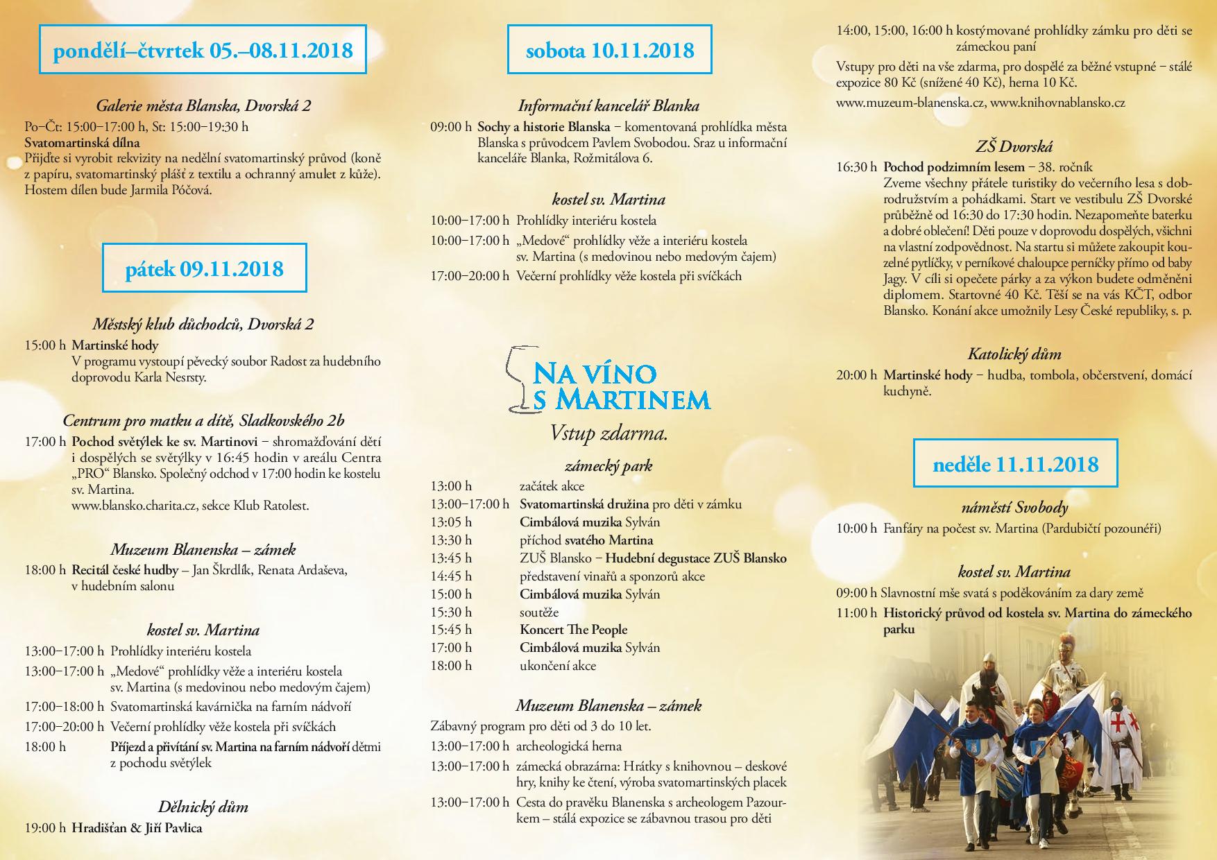 Následující víkend, na který připadá v neděli 11. listopadu i svátek svatého Martina, bude v Blansku nabitý. Patronem města je totiž právě svatý Martin, a proto zde berou svatomartinské oslavy opravdu vážně. Zaberou tři dny, během kterých se zabaví děti i dospělí. Svatý Martin je považován za patrona vojáků, koní, jezdců, hus a vinařů, a proto žádný z nich nebude na oslavách chybět.