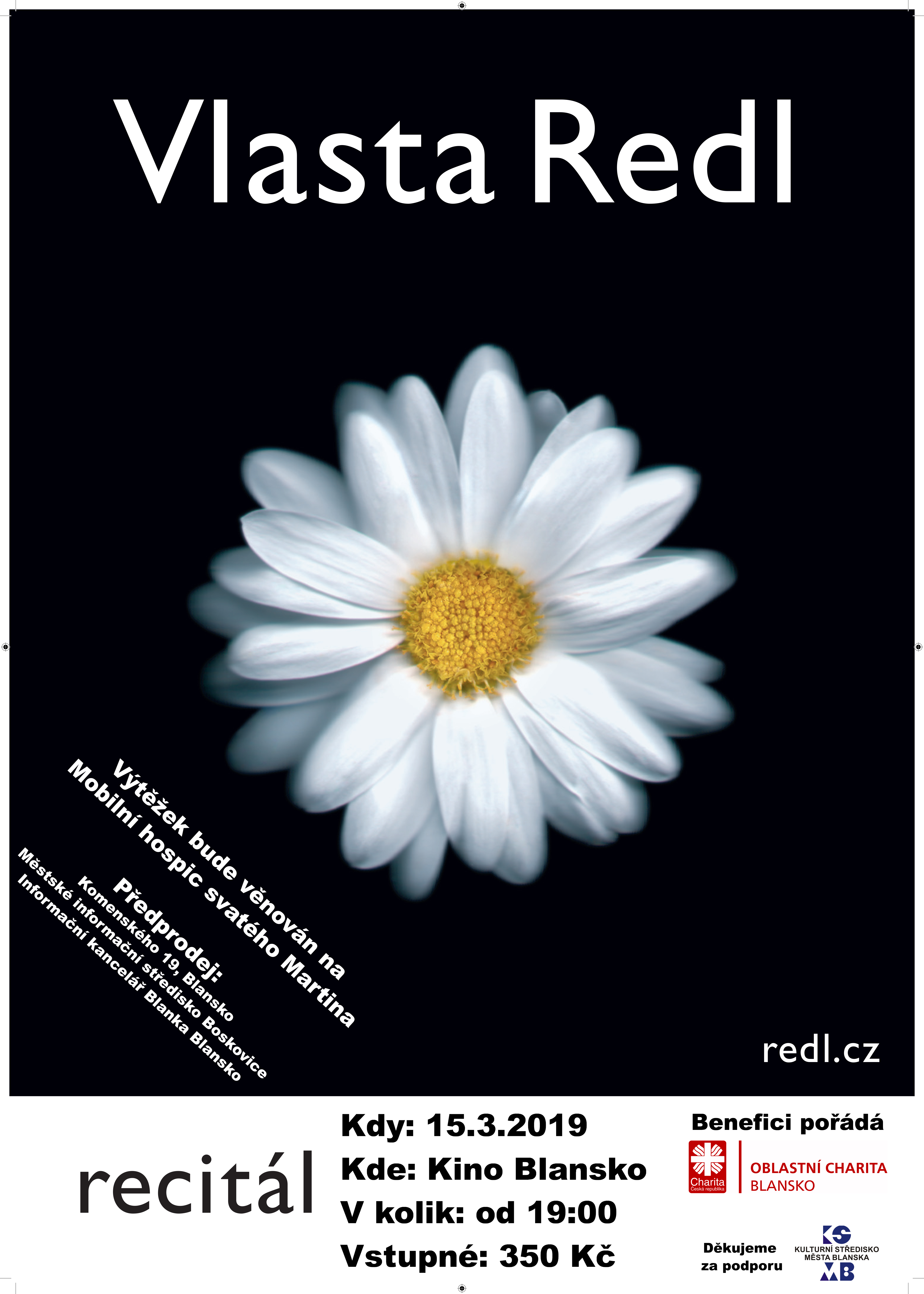 V blanenském kině vystoupí 15. března v 19 hodin písničkář Vlasta Redl s doprovodnou kapelou. Vstupenka stojí 350 korun a je k dostání v předprodeji v Blansku v Okně dokořán na Komenského 19 a v Informační kanceláři Blanka. V Boskovicích pak v Městském informačním středisku. Výtěžek koncertu půjde na potřeby Mobilního hospice sv. Martina, který pomáhá lidem v posledním stádiu nemoci po celém okrese Blansko.