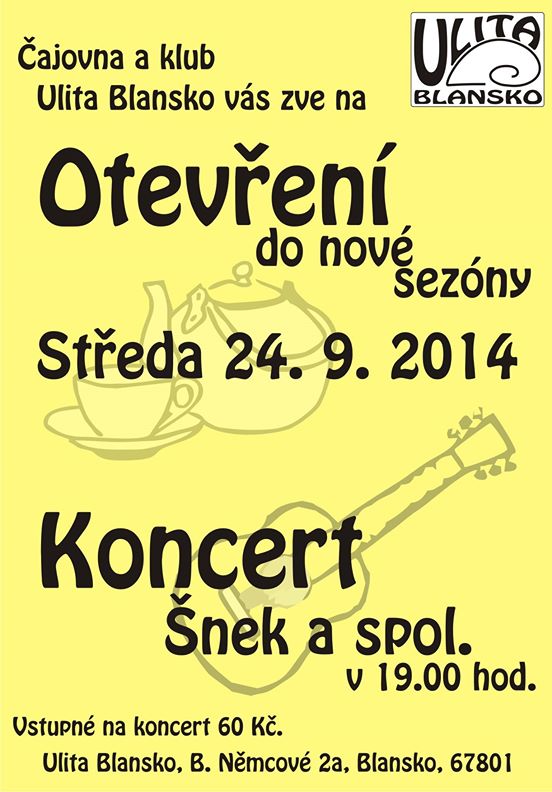 Po prázdninové rekonstrukci opět otvírá své prostory Čajovna a klub Ulita. Slavnostní otevření do nové sezóny proběhne ve středu 24. září. Návštěvníci se mohou těšit od 19:00 hodin na koncert Šneka a spol.